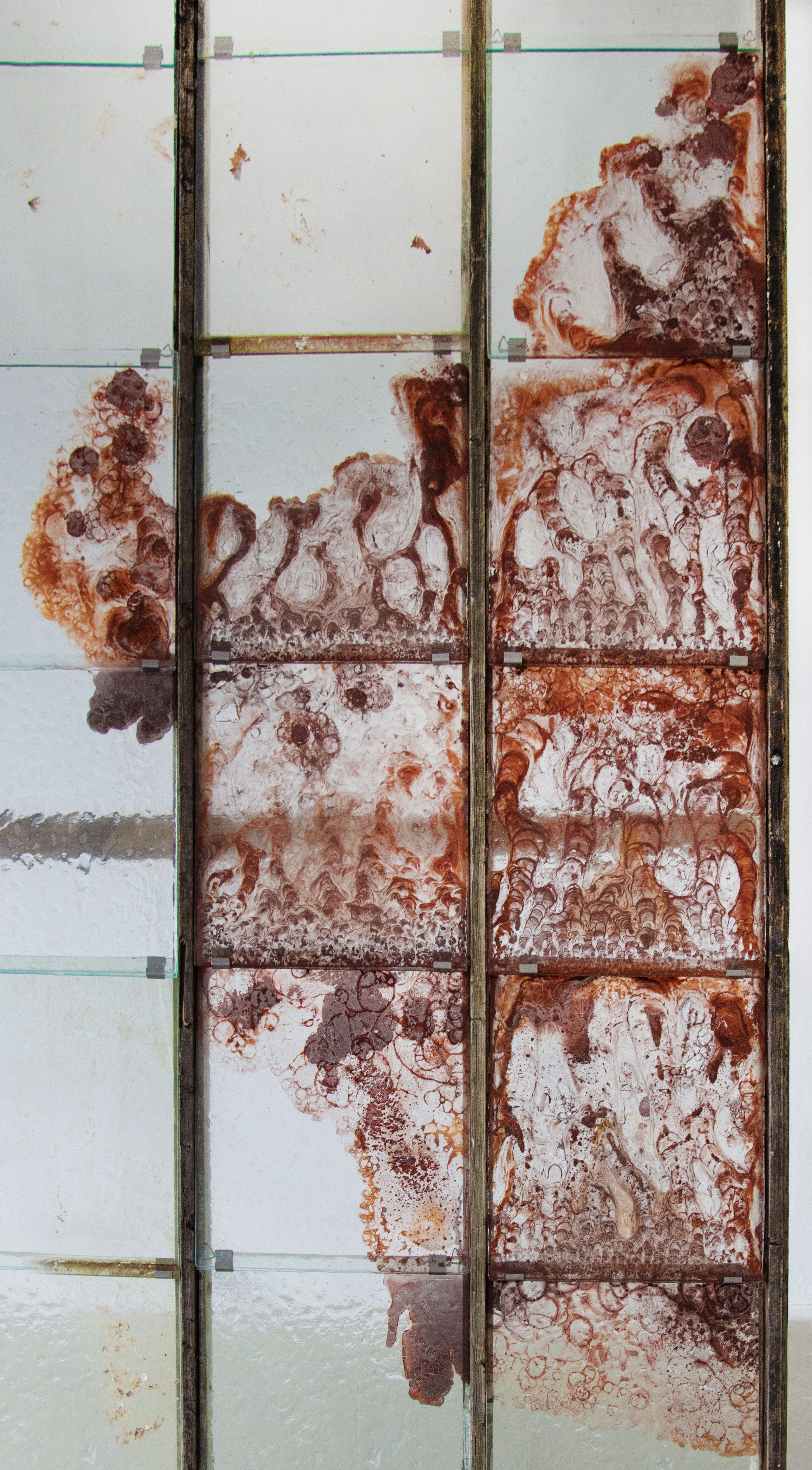 Ster Borgman, who sees themselves as a magical scientist, has been working with rust in glass as a natural pigment for their graduation in Fine Art at ArtEZ. They have built a greenhouse out of pigmented glass that makes the overgrowing quality of rust visible. Ster grew up in Aalsmeer, an area with old greenhouses. Some of them are abandoned and overgrown, making you wonder what grows inside. Rust is a growing crystal that slowly overgrows. It acts like it is not moving, but when you look away it starts dripping and leaking everywhere. Ster has been researching rust and glass as a queer way to leak out of the structure of Western science. Rust moves in a very slow time frame: it bursts out of the earth in the form of iron, oxidizes with rain, crystalizes and eventually it might again drip into the heat of the earth to melt back into iron. Ster makes black rust pigment and melts it in between pairs of glass plates in an oven at around 800˚C. The glass melts together and fixates the rust, which starts to boil and drip. Eventually, the rust changes colour by the heat - from black to different shades of red. These glass plates are stills, showing a fraction in the long life of rust in deep time. But perhaps after a year, eight years or eight hundred years, the glass breaks, crumbles back to sand and the rust will be free again.