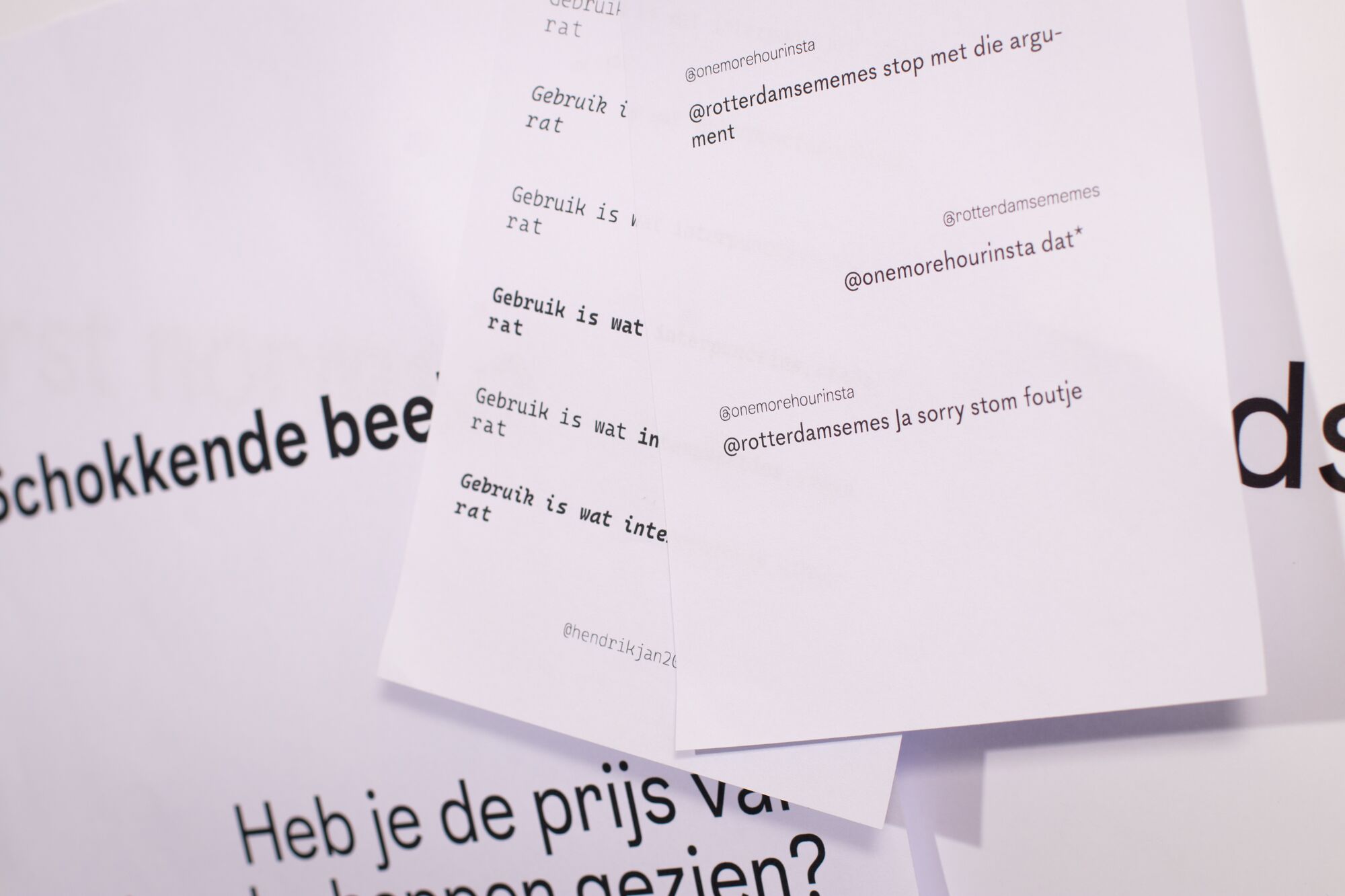 In mijn werk probeer ik het beeld zo te laten spreken dat er weinig tot geen uitleg nodig is. Ik leg liever niet uit wat kunst inhoudt, omdat ik geloof dat dit afbreuk doet aan het beeld. In mijn werk maak ik graag gebruik van een begrip dat weleens voyeurisme wordt genoemd: de interesse die wij mensen hebben voor het leven en het ‘bespieden’ van anderen. Zoals het bekijken van andermans huizen of het afluisteren van gesprekken in de trein. Door deze menselijke drang in te zetten, in de vorm van Instagram-opmerkingen, hoop ik dat de kijker vanzelf geïnteresseerd raakt in mijn werk. Op deze manier ga ik een directe relatie aan met het dagelijkse leven, waarin sociale media inmiddels een prominente rol speelt. Mijn onderzoek breng ik ook weer terug in deze online ruimte. De ontwerpen die ik heb gemaakt met de opmerkingen plaats ik weer op Instagram; hieronder tag ik dan de persoon die de opmerking in eerste instantie plaatste. Dit zorgt voor bijzondere interacties.