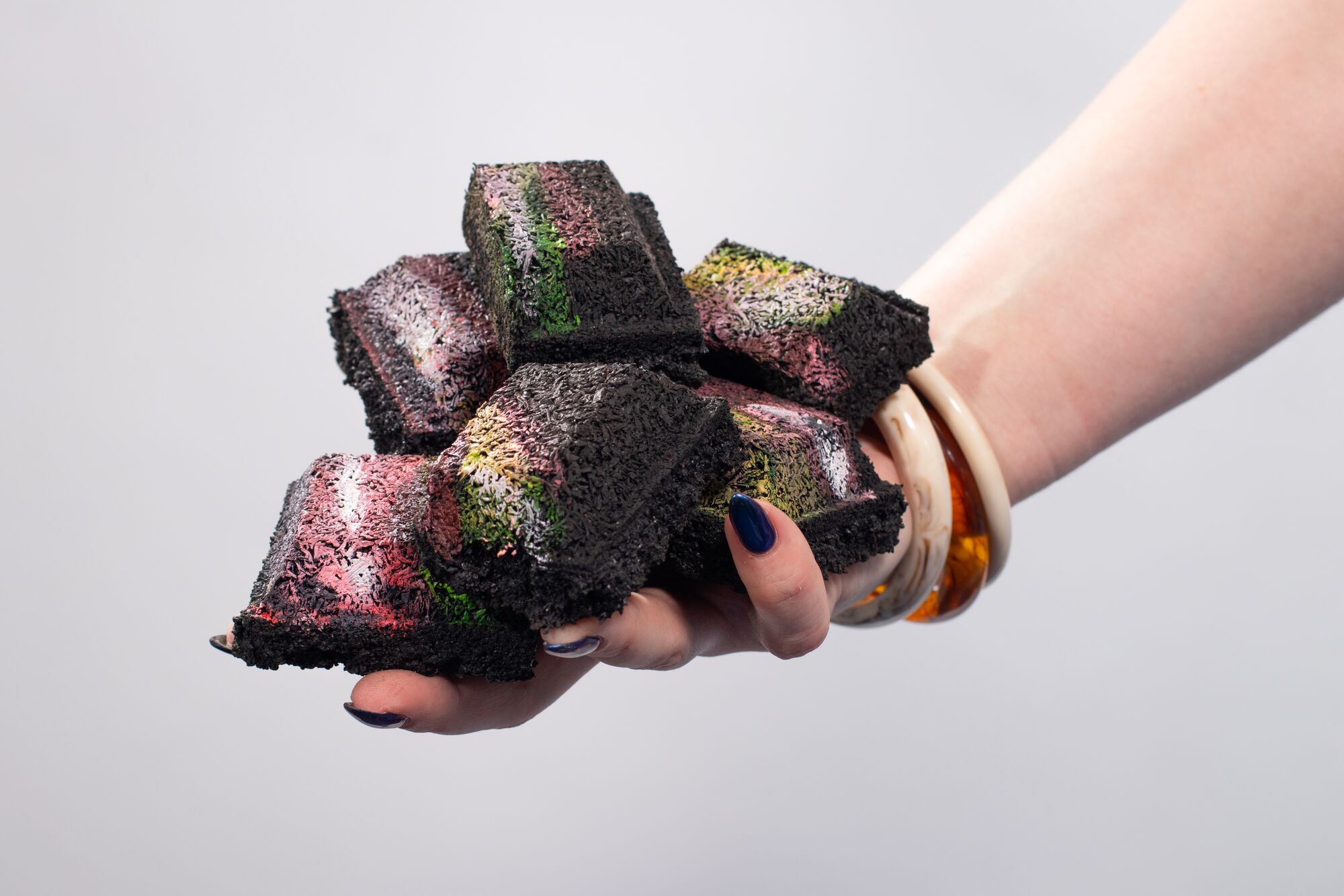 In mijn werk verbeeld ik drie levensfasen van mezelf. Elk portret is verbonden aan een specifieke kleurensymboliek en is geschilderd op rubberen tegels, die samen een installatie vormen. Deze tegels bieden een metafoor van veerkracht.
