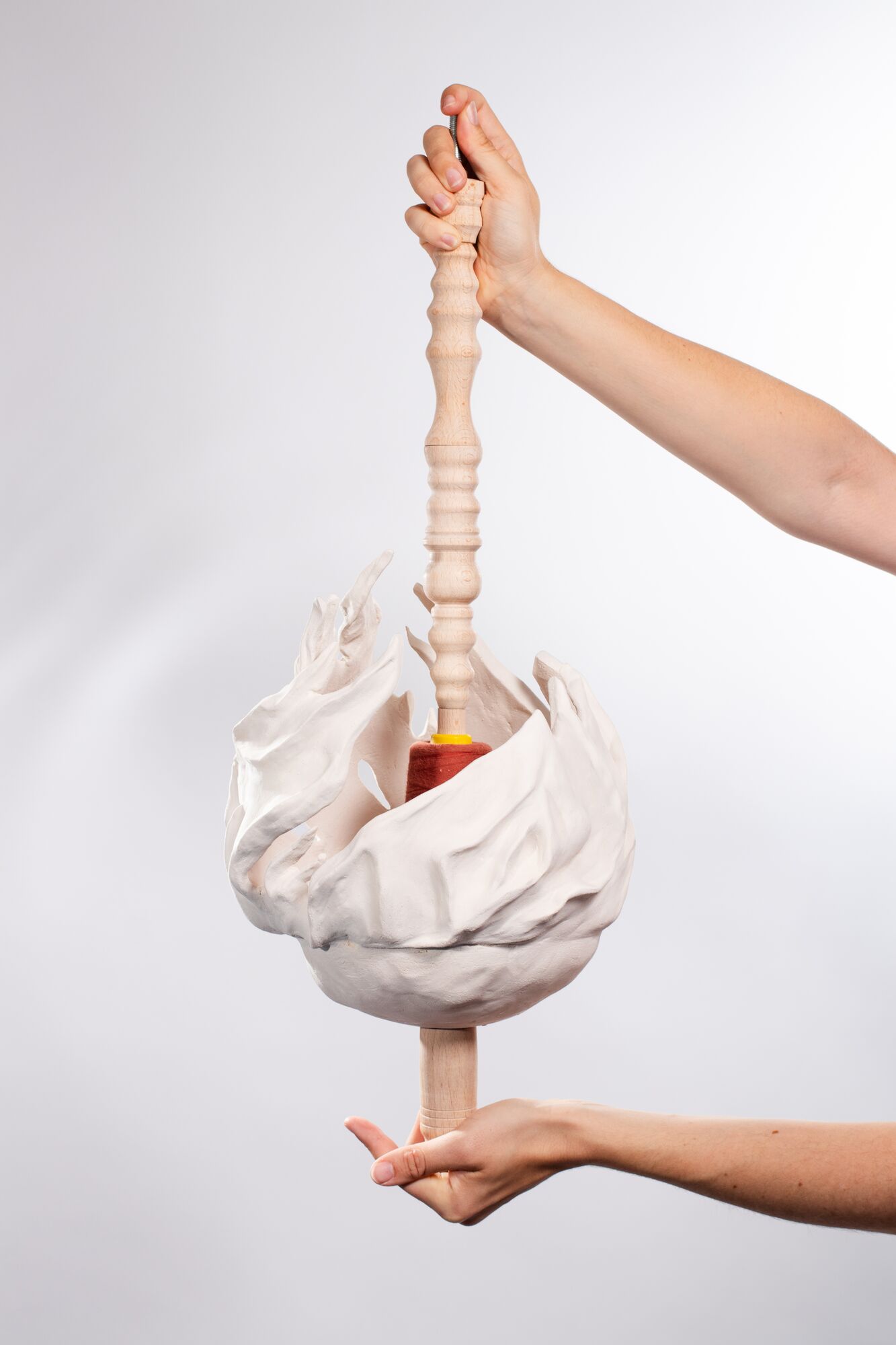 Keramiek heeft een speciaal plekje in mijn hart. Ik geniet ervan hoe fysieke handelingen directe resultaten teweegbrengen. Geen programma om te leren of knopjes om te onthouden, werken met klei voelt bij mij intuïtief. Ook ben ik een liefhebber van organische vormen waar het materiaal zich zo goed voor leent en dat, wanneer er iets misgaat, het materiaal vaak gerecycled kan worden. Mijn werk bestaat zelden uit 1 materiaal. Ik combineer graag, of het nou keramiek met stof drukken is, of crêpepapier en film. Mijn voorkeur gaat uit naar ruimtelijk en analoog werken, maar ik laat me leiden door het idee. Mijn concept bepaalt mijn materiaal en voor ik het weet ben ik weer een nieuwe techniek aan het leren.