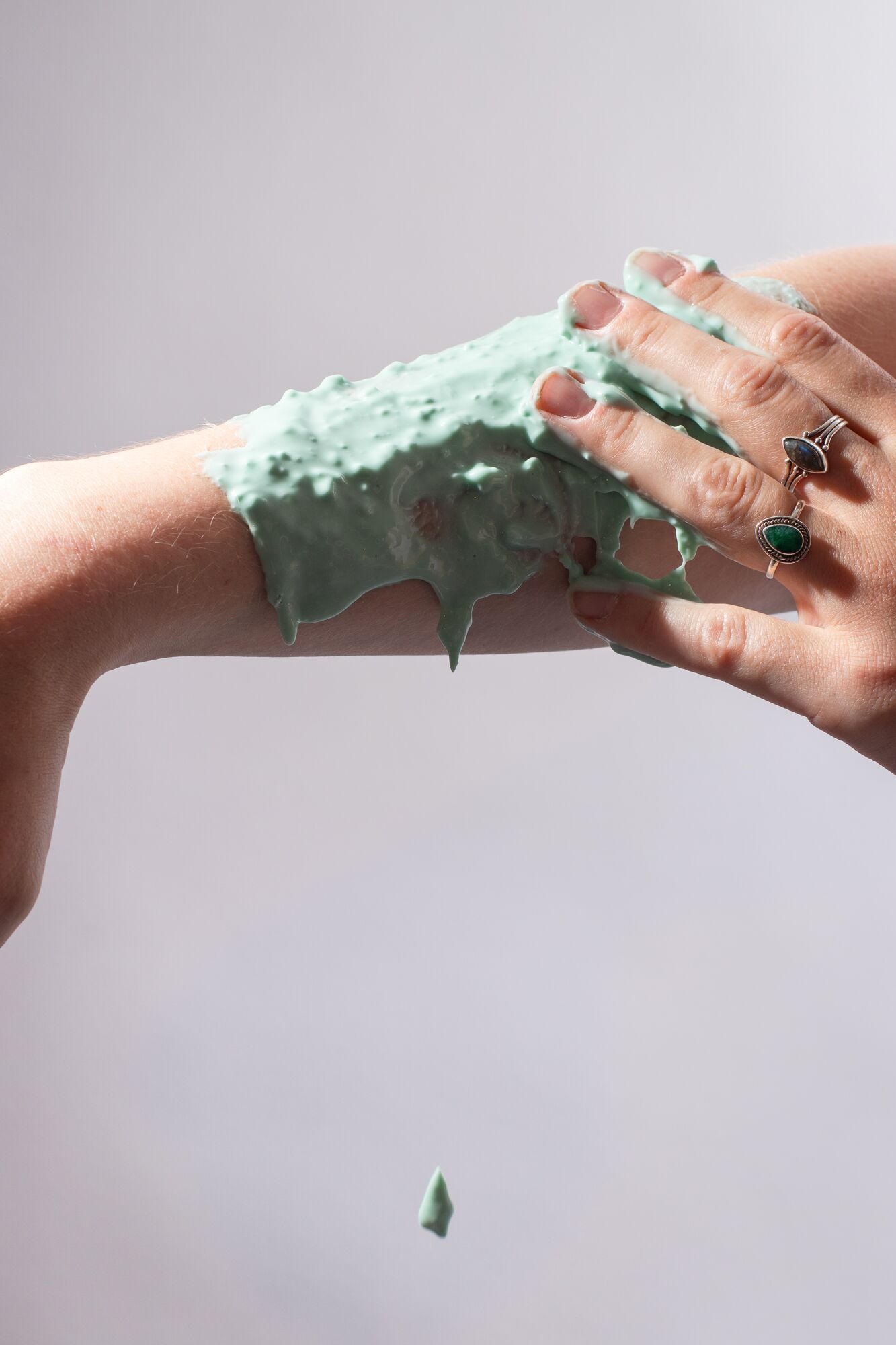 De handeling is een ritueel, Ik breng alginaat aan op mijn huid – een tweede huid, een poging om mezelf opnieuw te vormen. Ik haal het eraf. Laag na laag. Opnieuw. En opnieuw.